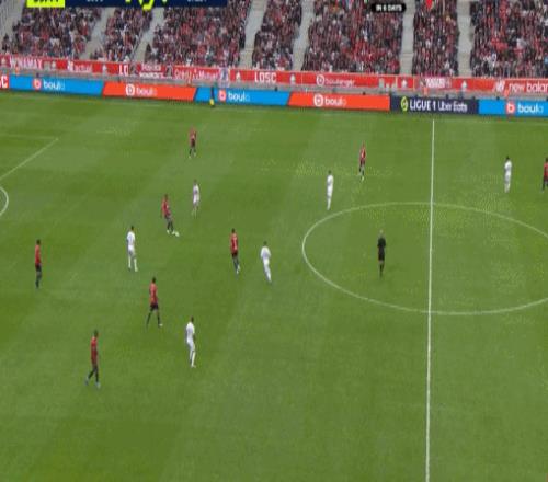 当时他在里尔主打四后卫体系里的右中卫,和三后卫的边中卫相比,位置稍微谨慎一点是正确的,但对手已经打到面前的进攻,约罗还是明显偏缩:
