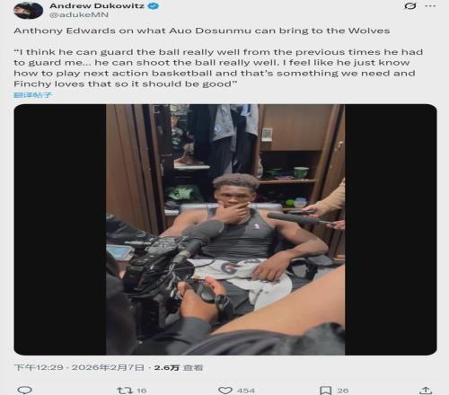 北京时间2月7日,NBA常规赛,森林狼115-119不敌鹈鹕。爱德华兹赛后接受采访谈到新援阿约-多森姆:“他防守能力很强,投篮也很准,这对我们来说是很棒的补充。”主帅芬奇说:“如果我不把多森姆排进轮换前8,我可能会被解雇。”
