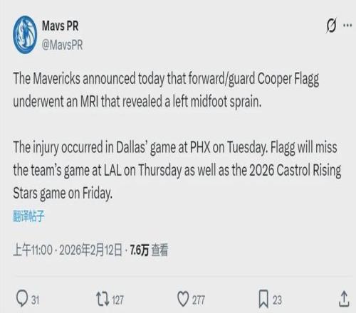 北京时间2月12日中午,达拉斯独行侠官方宣布:库珀-弗拉格接受了核磁共振检查,结果显示左脚中部扭伤。弗拉格将缺席明天独行侠和湖人的常规赛,同时退出2月14日开打的NBA新秀赛。这对NBA联盟来说,无疑是重大打击。