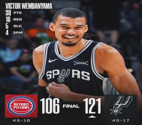 活塞内线斯图尔特赛后谈及如何防守文班:“我们必须更好地调动文班,直接冲击他的胸部!这是他的弱点所在,这样的话他会很挣扎。”此役过后,马刺45胜17负稳居西部第2和联盟第3,落后雷霆3个胜场,落后活塞只有0.5个胜场了。